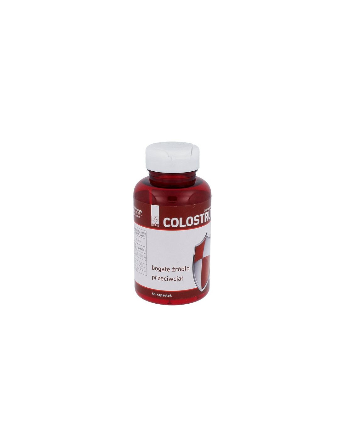 Colostrum, skład: Colostrum standaryzowane na min. 20% IgG (mleko), kapsułka (żelatyna, woda), maltodekstryna, substancja przeciwzbrylająca: sole magnezowe kwasów tłuszczowych. 1 kapsułka zawiera colostrum standaryzowane 350 mg, w tym min. IgG 70 mg.