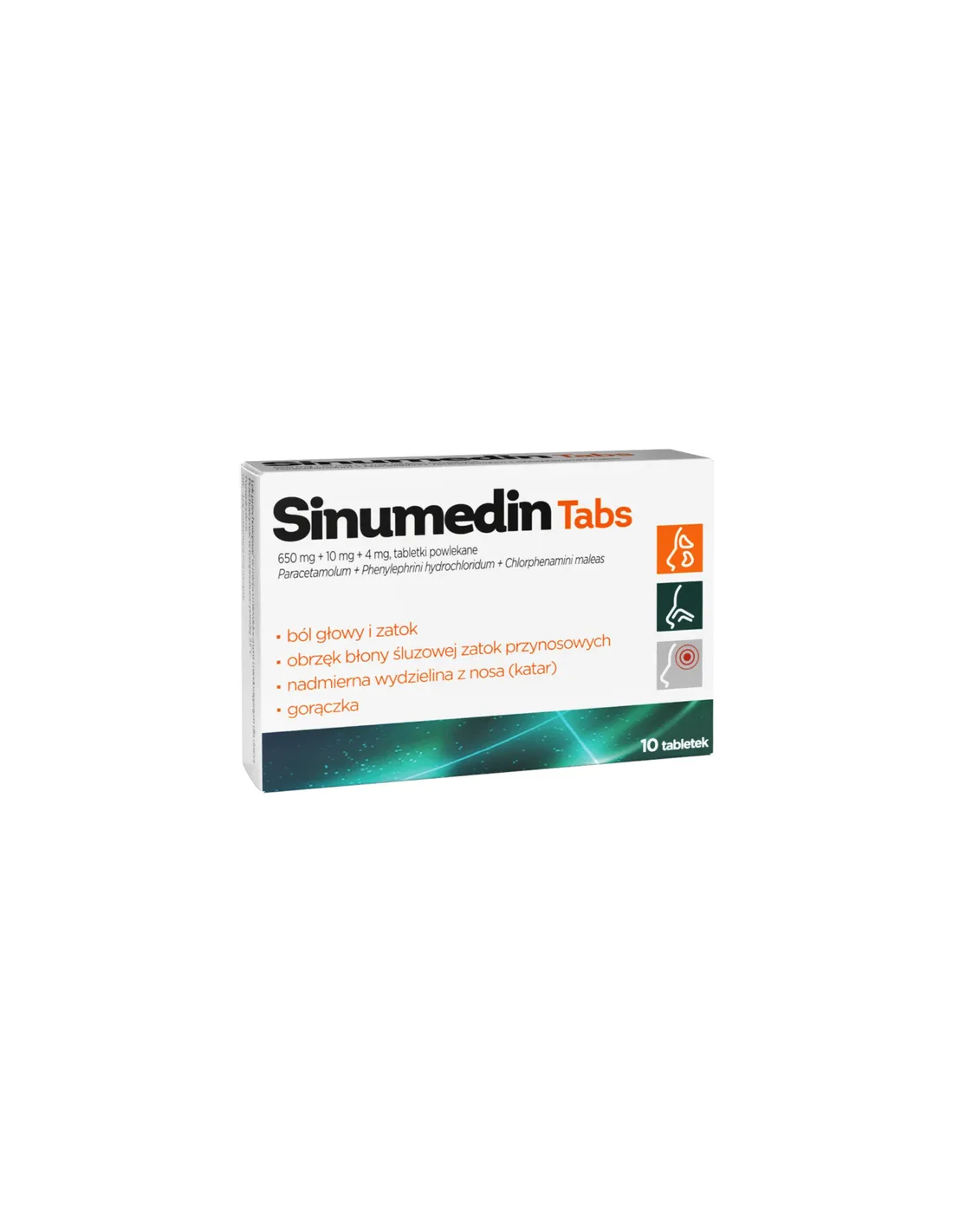 Sinumedin Tabs, skład: Substancjami czynnymi leku są: paracetamol (Paracetamolum), fenylefryny chlorowodorek (Phenylephrini hydrochloridum) i chlorofenaminy maleinian (Chlorphenamini maleas). Jedna tabletka powlekana zawiera: 650 mg paracetamolu, 10 mg fenylefryny chlorowodorku, 4 mg chlorofenaminy maleinianu. Pozostałe składniki to: rdzeń tabletki: powidon 30, kroskarmeloza sodowa, magnezu stearynian, Prosolv Easy tab SP: celuloza mikrokrystaliczna, krzemionka koloidalna bezwodna, sodu stearylofumaran, karboksymetyloskrobia sodowa (typ A), otoczka tabletki: hypromeloza, hydroksypropyloceluloza, brąz HT (E 155), czerwień koszenilowa (E 124), Capol 1295 (wosk biały i wosk Carnauba).